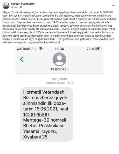 “Mayın 10-da vaksinasiya üçün randevu.its.gov.az saytında qeydiyyatdan keçərək saat 14:00-15:00 üçün 39 saylı şəhər poliklinikasına yaxınlaşsam da, vaksinasiya oluna bilmədim”.