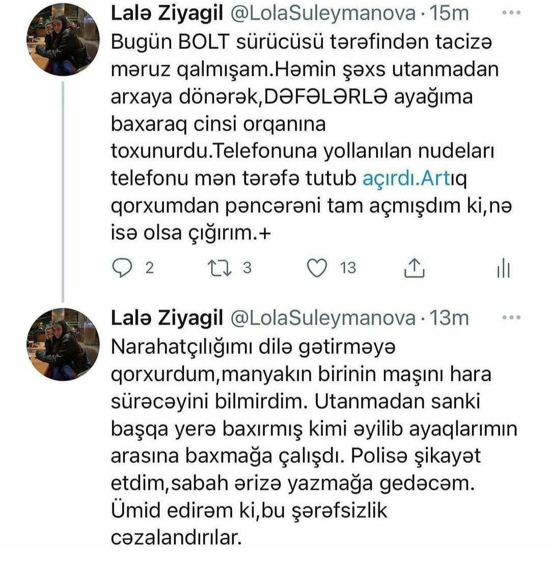 “Bu gün “BOLT” taksi sürücüsü tərəfindən təcavüzə məruz qalmışam. Sürücü dəfələrlə arxaya çönüb ayaqlarıma baxaraq, cinsi orqanına toxunurdu. Qorxumdan pəncərəyə tərəf boylanmışdım ki, nəsə olsa qışqrıım. Utanmadan sanki harasa baxırmış kimi əyilib ayaqlarıma baxırdı. Polisə şikayət etdim, ərizə yazacam”.