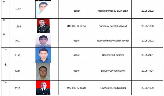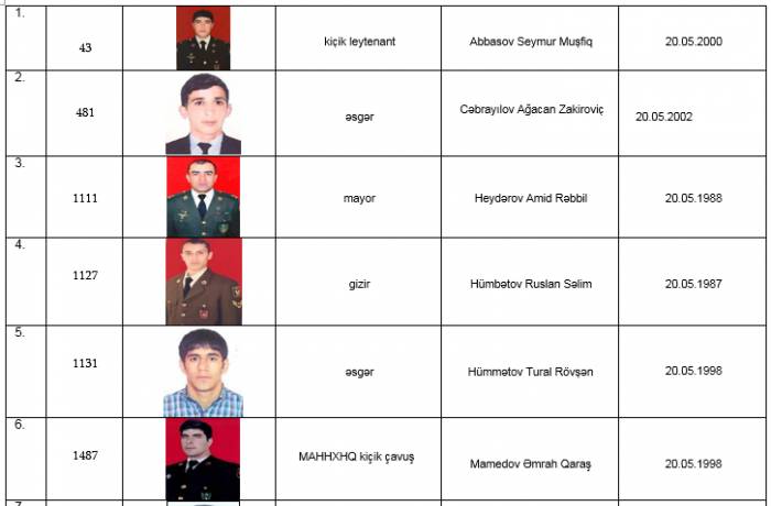 Siyahıda şəhidlərin və itkin düşən hərbi qulluqçuların adları, rütbələri, fotoları və doğum tarixləri qeyd olunub.