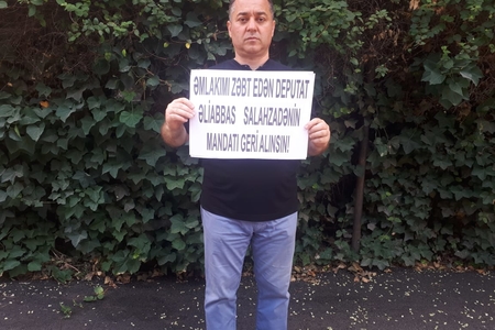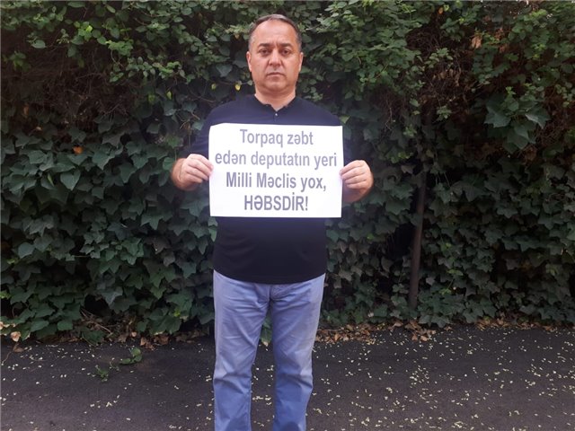 Azərbaycan vətəndaşı Seymur Quliyev Milli Məclisin qarşısında təkadamlıq aksiya keçirib. Seymur Quliyev Sabunçu rayonundan deputat Əliabbas Salahzadənin və yaxınlarının onun özəl torpaq sahəsini zəbt etmələrinə bu şəkildə etiraz edib.