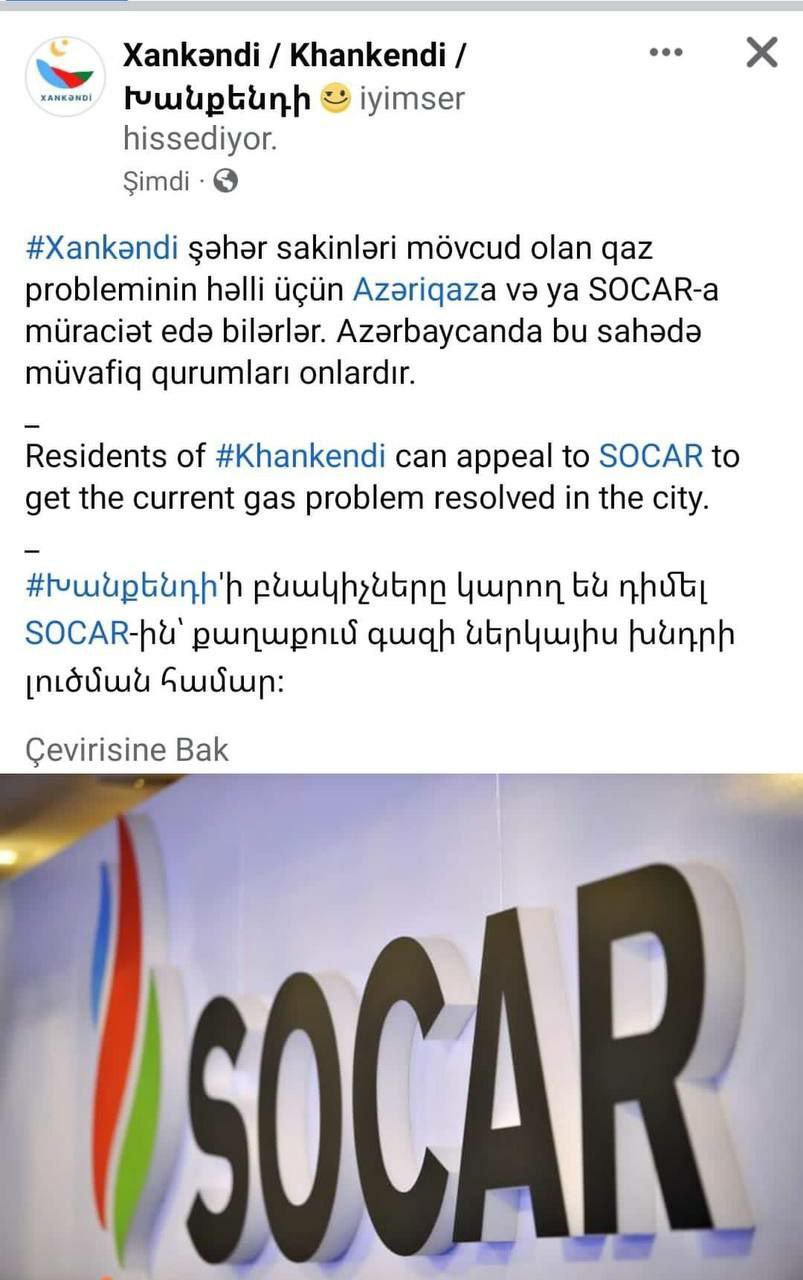 Ermənilər bu problemin həll olunması üçün Azərbaycana müraciət edəcək. Bunu erməni fəal, Xankəndində yaşayan Geqam Sasuryan bildirib.”Biz bir neçə dəfə etirazımızı bildirimişik. Özlərinə respublika quran Araik Aruthunyan və komandası bizim problemlərimizi həll etmək gücündə deyil Təbi qaz yoxdur, enerji gün ərzində cəmi 2 saat verilir, su, çörək ciddi problemə çevrilib. Bizim ümid yerimiz Azərbaycandır. Bunun üçün imza toplayırıq. Tezliklə Azərbaycan bizim problemlərimizi həll etməlidir”-deyə Sasuryan bildirib. Xatırladaq ki, sosial şəbəkələrdə qaz və enerji problemi olan erməni sakinlərinin SOCAR və Azəriqaz-a müraciət etməsi haqqında xəbərlər yayılıb. Bundan ilhamlanan ermənilər Azərbaycana müraciət etmək istəyir.