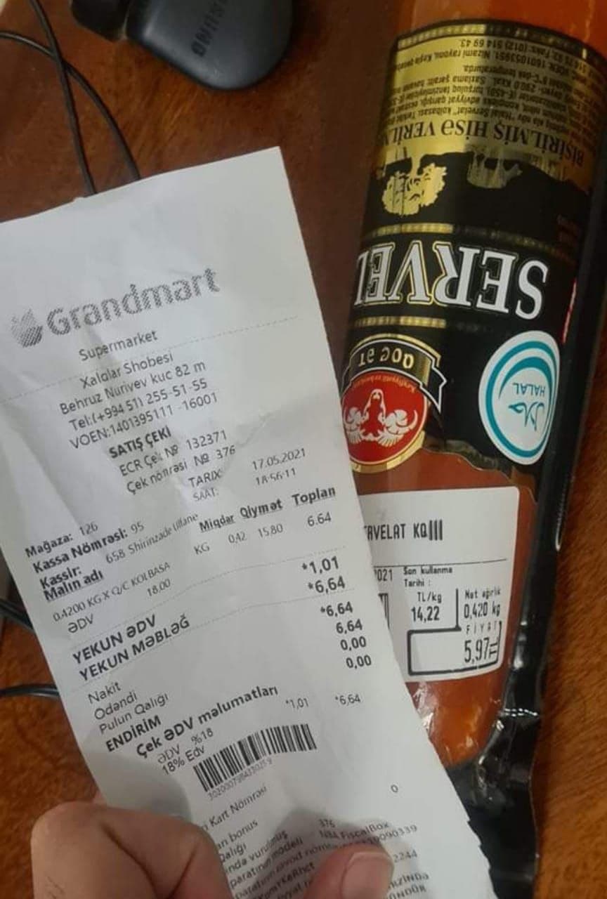 Növbəti narazılıq “Grand Market”- lə bağlı baş verib. Bu dəfə istehlakçının rəfdən 5.97 AZN-ə götürdüyü Servelat kolbasanın qiyməti kassaya çatanadək 6,64 AZN-ə qədər “bahalaşıb”. İstehlakçı isə dəfələrlə bu kimi hallarla qarşılaşdığını bildirir.