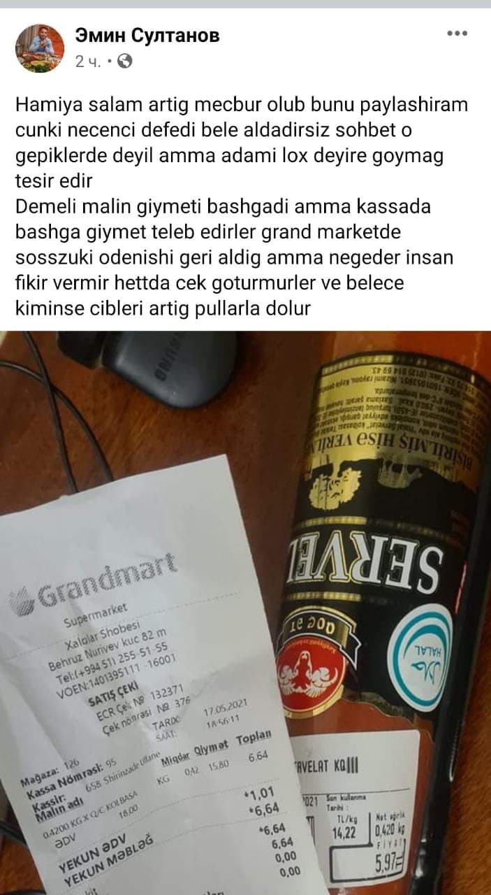 “Nizami küçəsi 129 ünvanında yerləşən “Grand Market”də 8 manatlıq məhsul üçün kartdan 68 manat çıxılıb. İstehlakçılara tövsiyyə edirəm ki, kartla ödəniş edərkən, mütləq telefon nömrələrinə gələn SMS-lərə baxsınlar, kassa çekini saxlasınlar”.