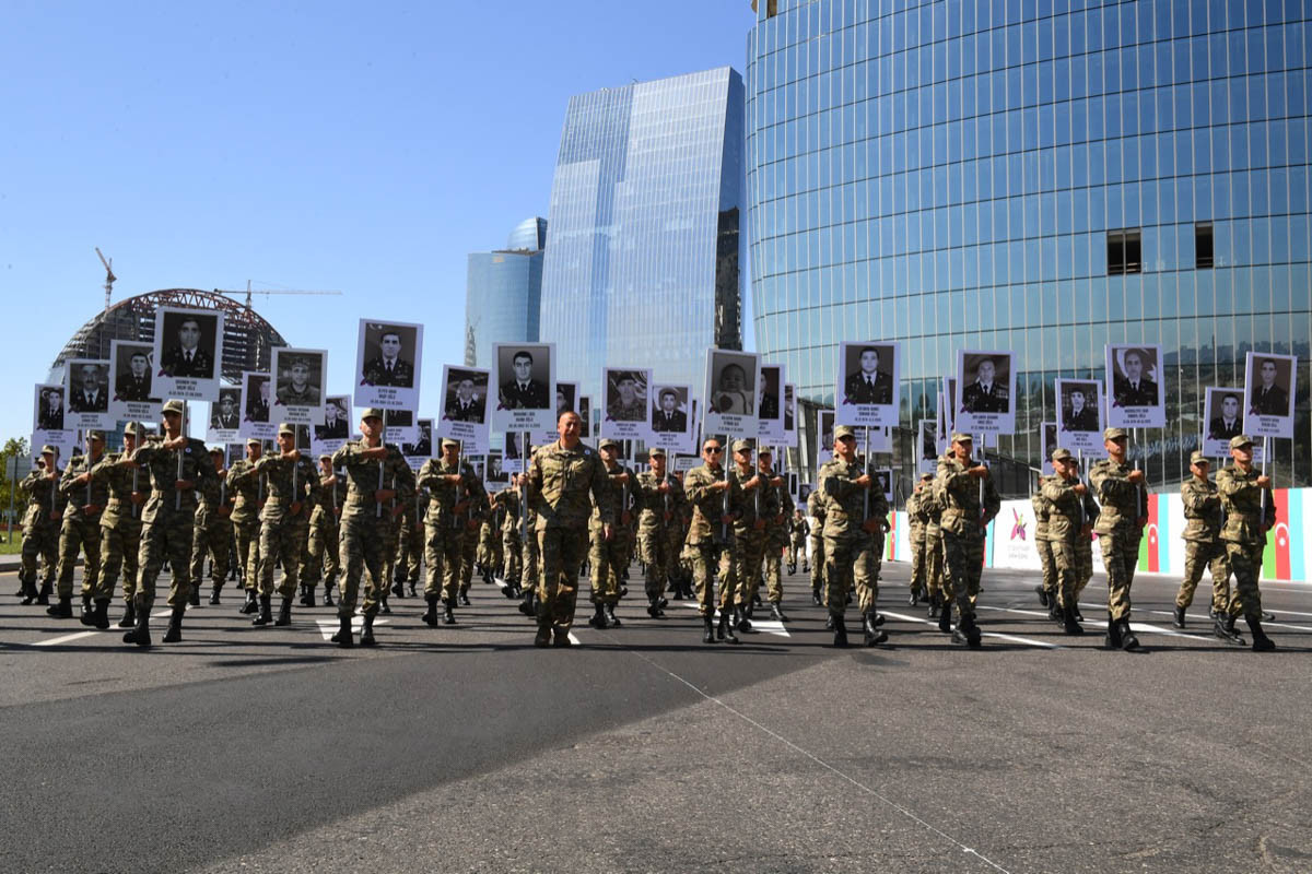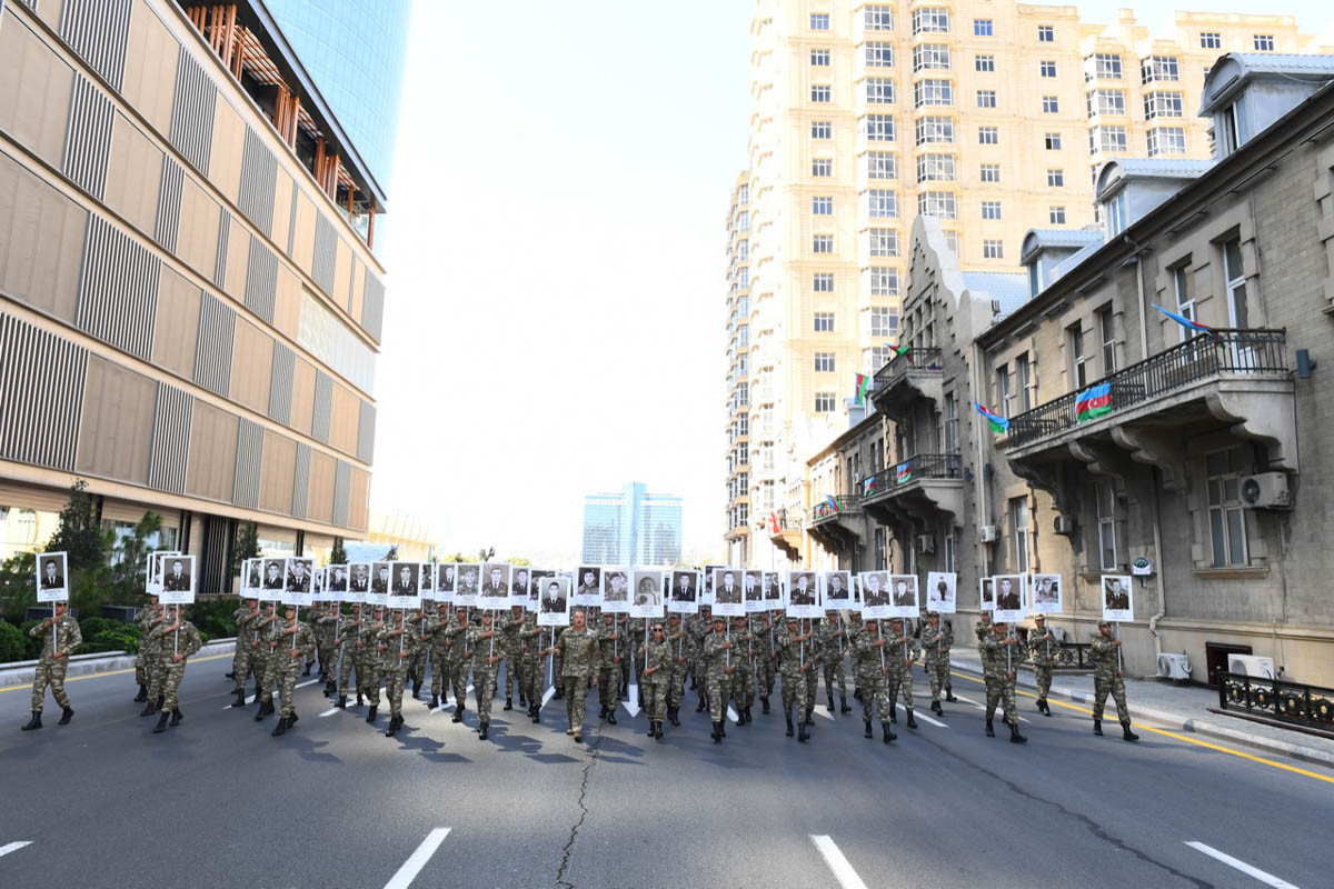 Azərbaycan Respublikasının Prezidenti, Ali Baş Komandan İlham Əliyev, birinci xanım Mehriban Əliyeva, gənc kursantlar və hərbçilər Vətən müharibəsi zamanı Azərbaycanın ərazi bütövlüyü uğrunda şəhid olan igidlərimiz, itkin düşən hərbçilərimiz və Ermənistan dövləti tərəfindən törədilən insanlıq əleyhinə və müharibə cinayətləri nəticəsində qətlə yetirilən mülki əhalimizin hər birinin fotolarından ibarət plakatlarla yürüş edərək xalqın birliyinin daimi və sarsılmaz olduğunu, Vətənə sevgi, şəhidlərimizə ehtiramın sonsuzluğunu bir daha nümayiş etdirib.