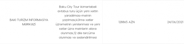 Bakı Turizm İnformasiya Mərkəzi 2021-ci ilin iyun ayının 24-də “Baku City Tour ikimərtəbəli avtobus turu üçün yeni xəttin yaradılması-mətnin yazılması, köhnə xətlər üzrəmətnin yenilənməsi və yeni xətlər üzrə mətnlərin əlavə olunması, 12 dilə tərcümə olunması və səsləndirilməsi” lotu üzrə sifarişçi olduğu tenderə yekun vurub.