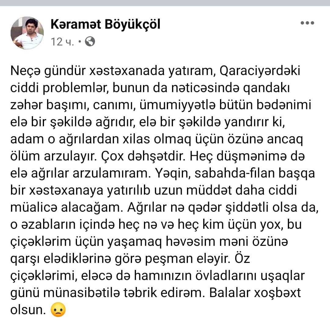 “Neçə gündür xəstəxanada yatıram, qaraciyərdəki ciddi problemlər, bunun da nəticəsində qandakı zəhər başımı, canımı, ümumiyyətlə bütün bədənimi elə bir şəkildə ağrıdır, elə bir şəkildə yandırır ki, adam o ağrılardan xilas olmaq üçün özünə ancaq ölüm arzulayır. Çox dəhşətdir. Heç düşmənimə də elə ağrılar arzulamıram. Yəqin, sabahda-filan başqa bir xəstəxanaya yatırılıb uzun müddət daha ciddi müalicə alacağam”.