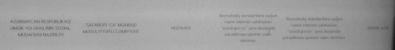 Azərbaycan Respublikası Əmək və Əhalinin Sosial Müdafiəsi Nazirliyi rəsmi internet saytının yaradılması üçün tender elan edib. Alp.az xəbər verir ki, tenderin qalibi “SAFAROFF CA” Məhdud Məsuliyətli Cəmiyyəti olub. Beynəlxalq standartlara uyğun rəsmi internet səhifəsinin “sosial.gov.az” yeni dizaynda yaradılması işlərinin satın alınması üçün 33000 min manat ayırıb.