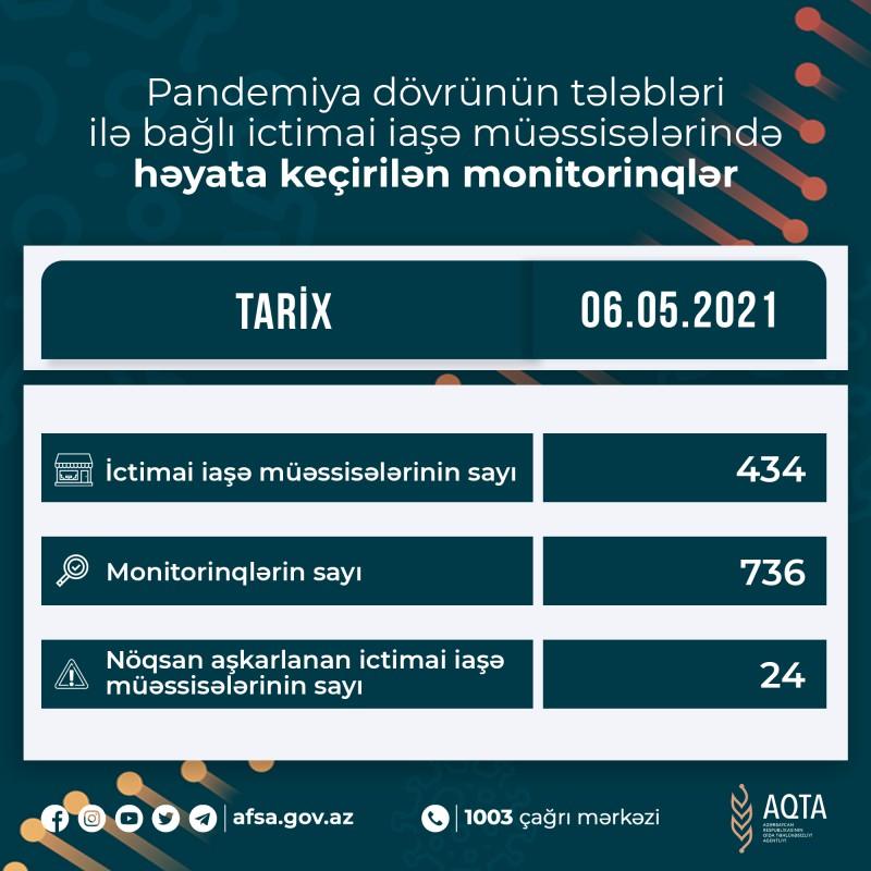 Qeyd edək ki, AQTA tərəfindən Bakıda, eləcə də regionlarda fəaliyyət göstərən ictimai iaşə obyektlərində monitorinqlərin miqyası genişləndirilib. Hazırda AQTA müfəttişləri tərəfindən respublika üzrə monitorinqlər davam etdirilir və qaydalara əməl etməyən sahibkarlıq subyektləri barədə ən sərt tədbirlər görüləcək.