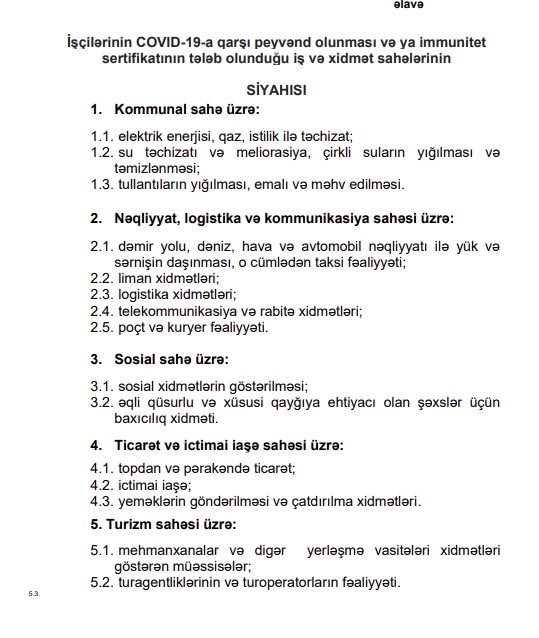 dövlət orqanlarının (qurumlarının) əməkdaşlarının, habelə aşağıda qeyd olunan müəssisələrin işçilərinin (əmək və ya mülki müqavilələrlə işləməsindən asılı olmayaraq) azı 80 faizinin COVID-19-a qarşı birinci doza, 1 oktyabr tarixindən etibarən isə ikinci doza peyvənd olunması və ya COVID-19-a qarşı immunitet sertifikatının olması tələb olunur: