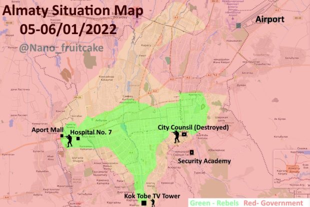 Bildirilir ki, yanvarın 6-da “yaraqlılar” Alma-Atanın əsas hissəsinə, o cümlədən mühüm obyektlərə nəzarət edirdi, onlar şəhərin yaşayış rayonları üzərində də nəzarəti ələ keçirməyə çalışırdı.