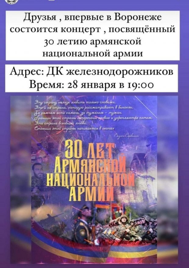 Rusiyanın Voronej şəhərində Ermənistan ordusunun yaradılmasının 30 illiyi münasibətilə konsert təşkil olunması baş tutmayıb.