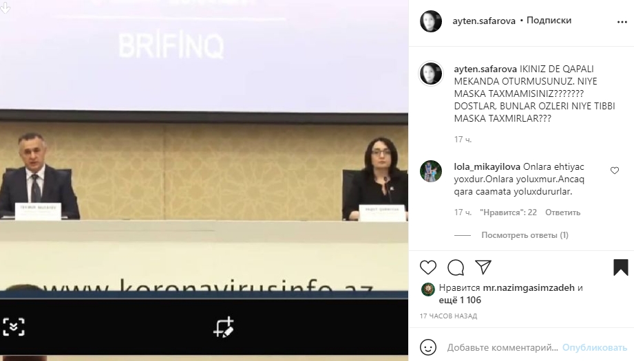 “İkiniz də qapalı məkanda oturmuşunuz. Niyə maska taxmamısınız? Özləri niyə tibbi maska taxmırlar? Bütün yayı maskada xəbərlər apardım, səsim çox aydın eşidilirdi” deyə, A.Səfərova bildirib.