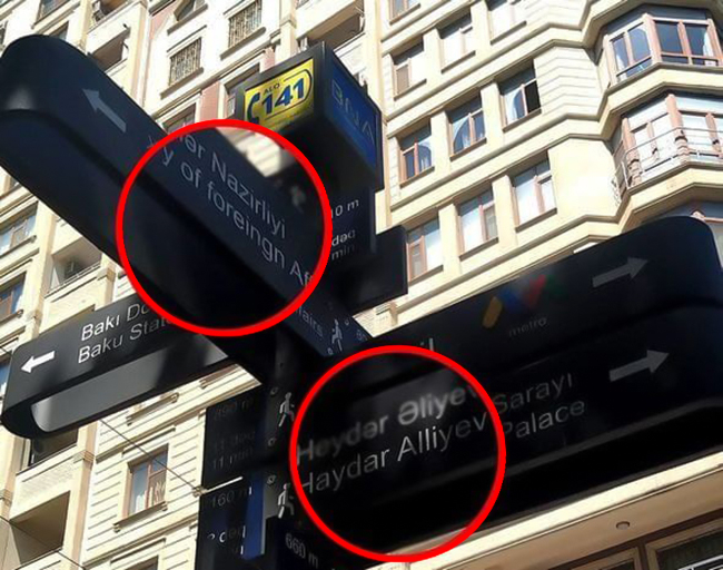 Fotodan görünür ki, Bakı Nəqliyyat Agentliyinin sifarişi əsasında hazırlanan məlumat lövhəsində Heydər Əliyevin adı ingilis dilində düzgün yazılmayıb.
