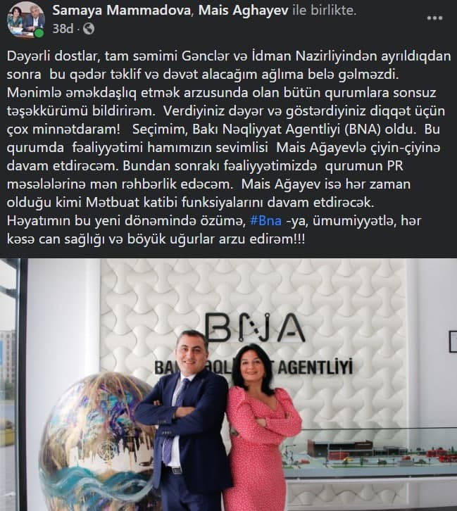 S. Məmmədova bundan sonra Bakı Nəqliyyat Agentliyində (BNA) PR məsələlərinə rəhbərlik edəcək.